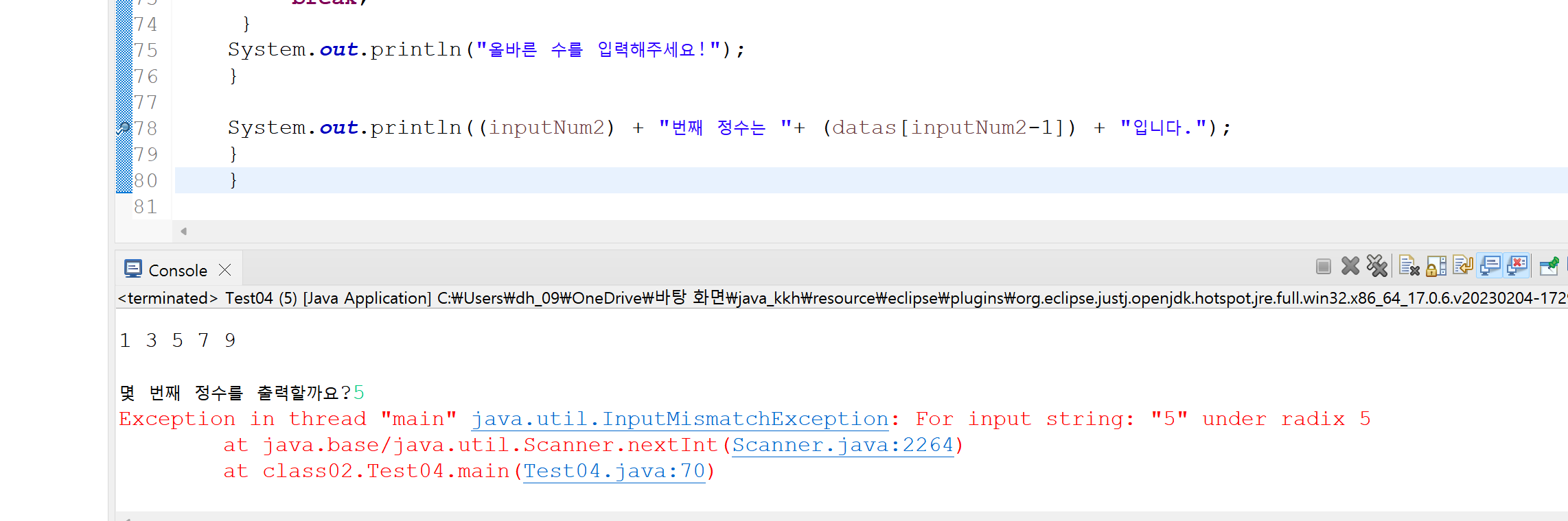 System.out.println((inputNum2) + "번째 정수는 "+ (datas[inputNum2-1]) + "입니다.");