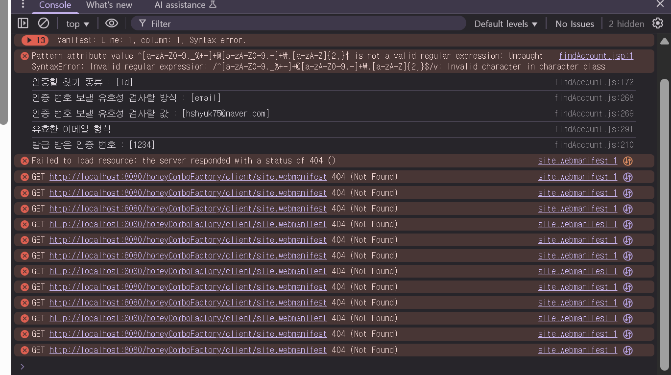 이메일 발송이 안되길래 F12로 확인해보니 자꾸 이런 에러가 뜨고 있었다