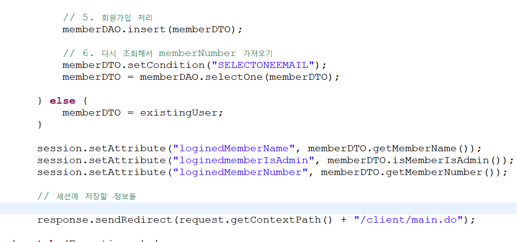 그래서 MEMBER DAO를 확인해보니 세션에 회원 번호, 회원 이름, 관리자 여부를 저장해주고 있는데 현재 회원 번호만 뽑아와서 회원 이름이나 관리자 여부가 NULL이 될 수 밖에 없는 것이다.