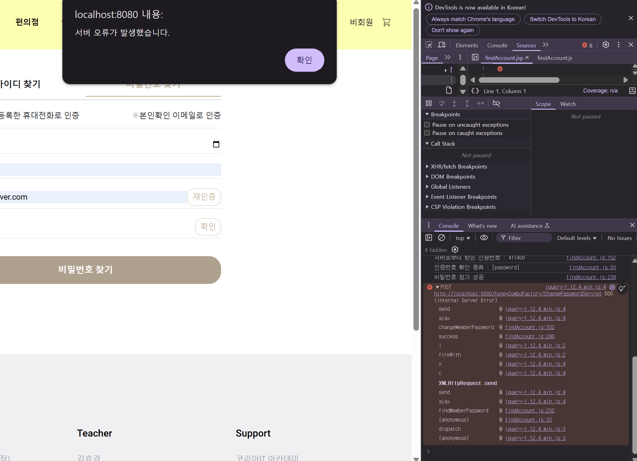 비밀번호 찾기 서블릿에서 setCondition이 빠져있었기 때문에 발생한 에러