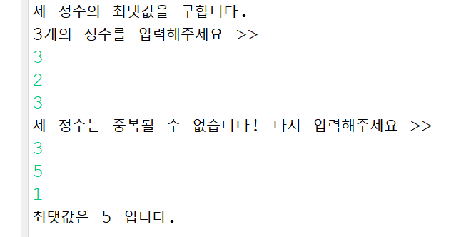 세 정수가 중복될 때는 다시 입력받을 수 있도록 while문과 종료조건을 추가하였다.