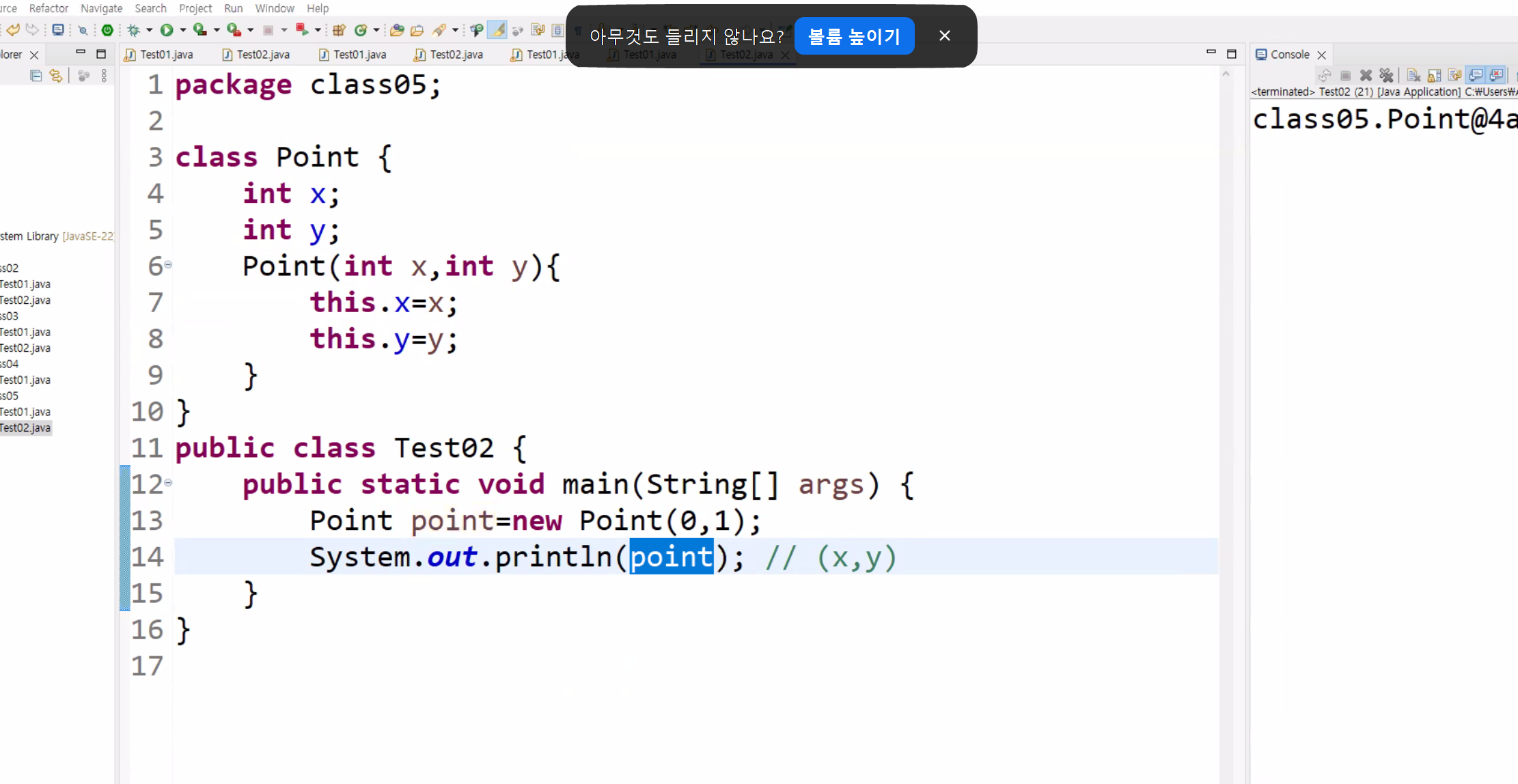 point는 객체라서 힙 메모리에 저장된 주소(해시코드)가 나옴
