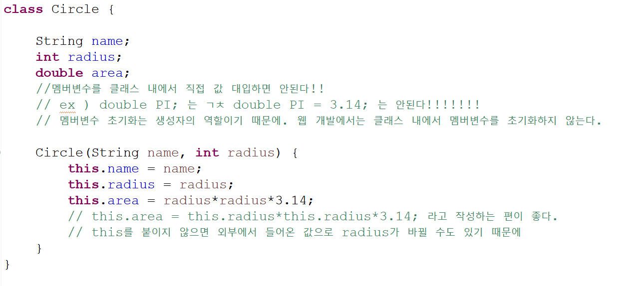 ■ 멤버변수 초기화는 생성자의 역할이므로, 클래스 내에서 멤버변수 초기화 하지 않기