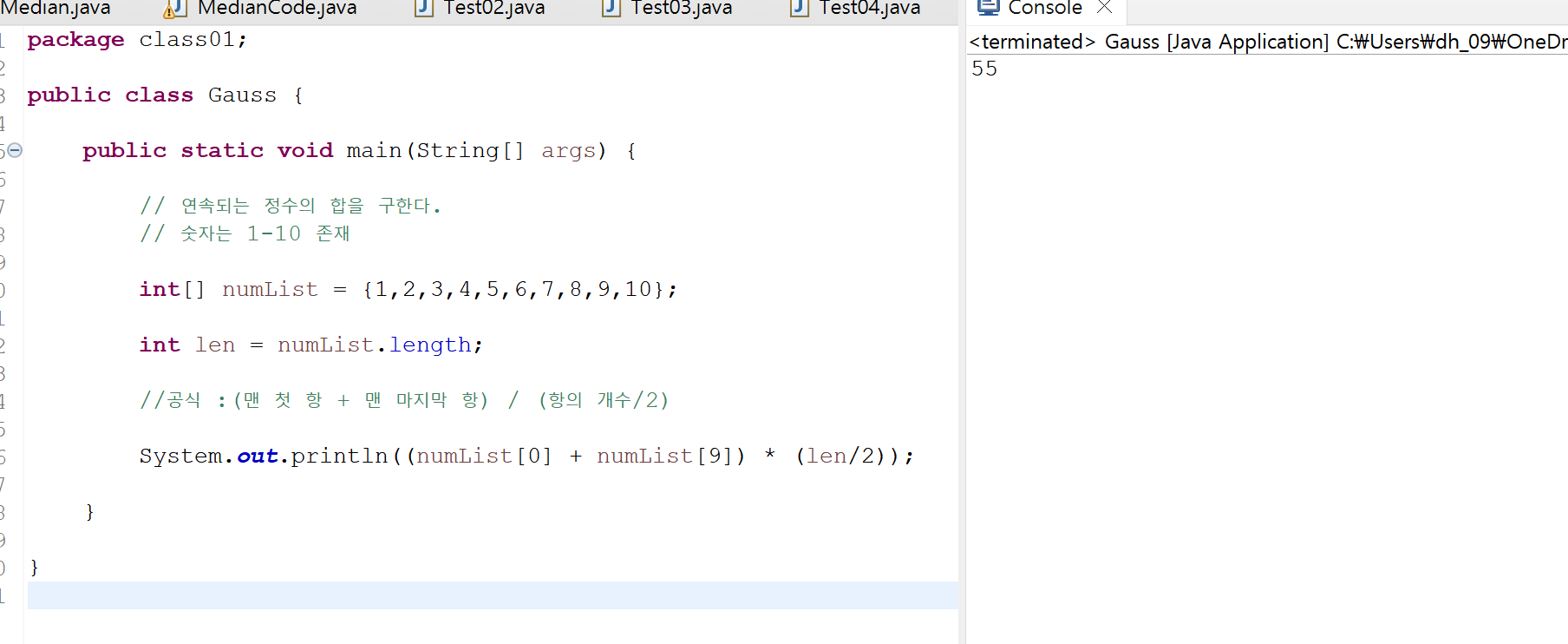 //공식 :(맨 첫 항 + 맨 마지막 항) / (항의 개수/2)
