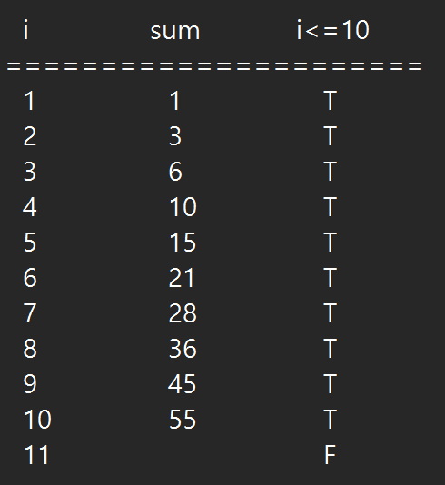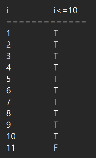 i = 11이 되면 i <= 10을 불충족하여 while문을 벗어난다.