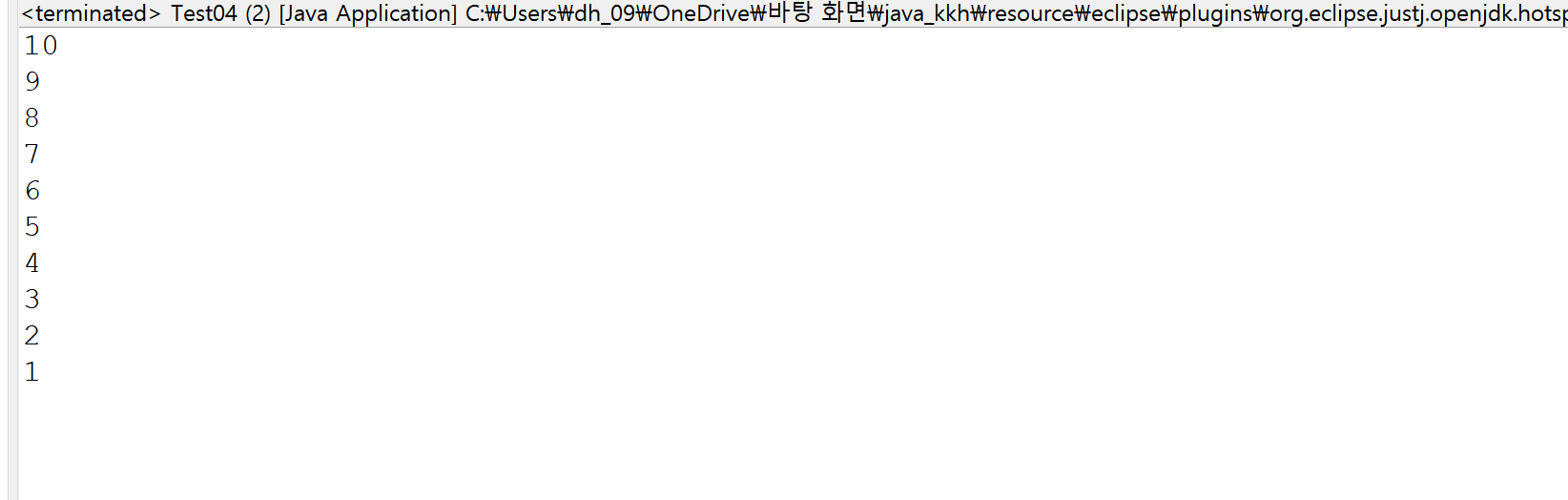 10부터 1까지 이므로 i는 10으로 초기화하고 i++ 대신 i--를 사용하면 된다. 그리고 1까지 더하므로 조건은 while(i>=1)이 되면 된다.