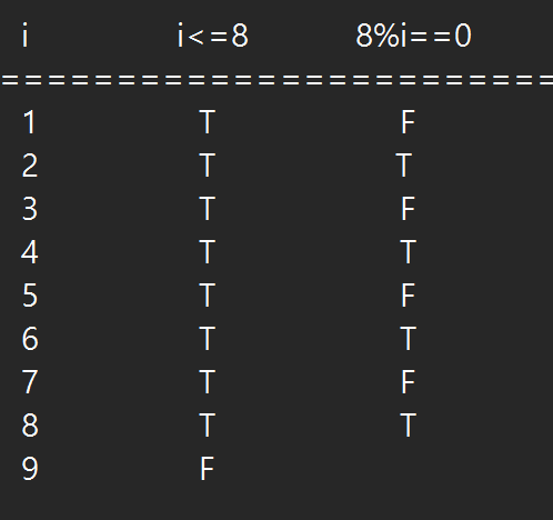 8의 약수만 출력되게 하고, i가 9가 되면 while문을 탈출한다.