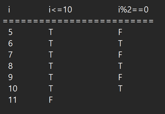 또한, i%2 != 0이 F인 수들은 홀수에 해당하지만 홀수는 출력하지 말라고 하였으므로, continue를 통해서 실행하지 않고 while로 돌아간다.