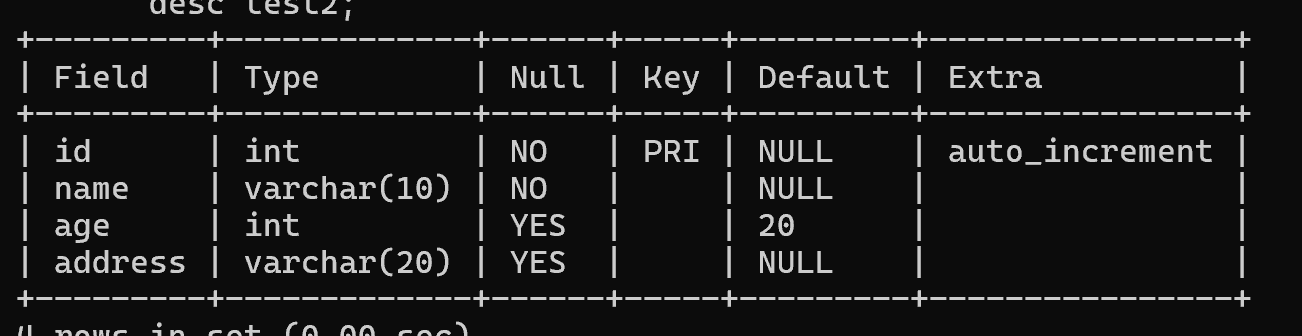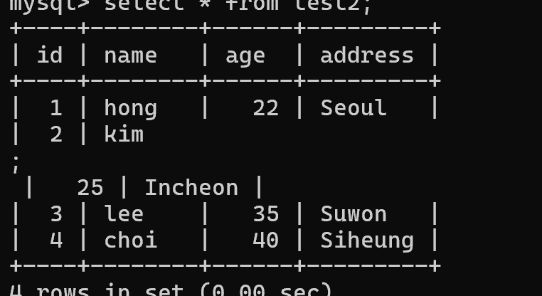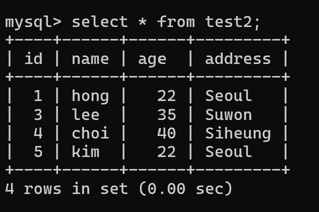 이건 뭐지... 입력하다가 세미콜론이 잘못들어가서 delete from test2 where id = 2;로 삭제해주었다.