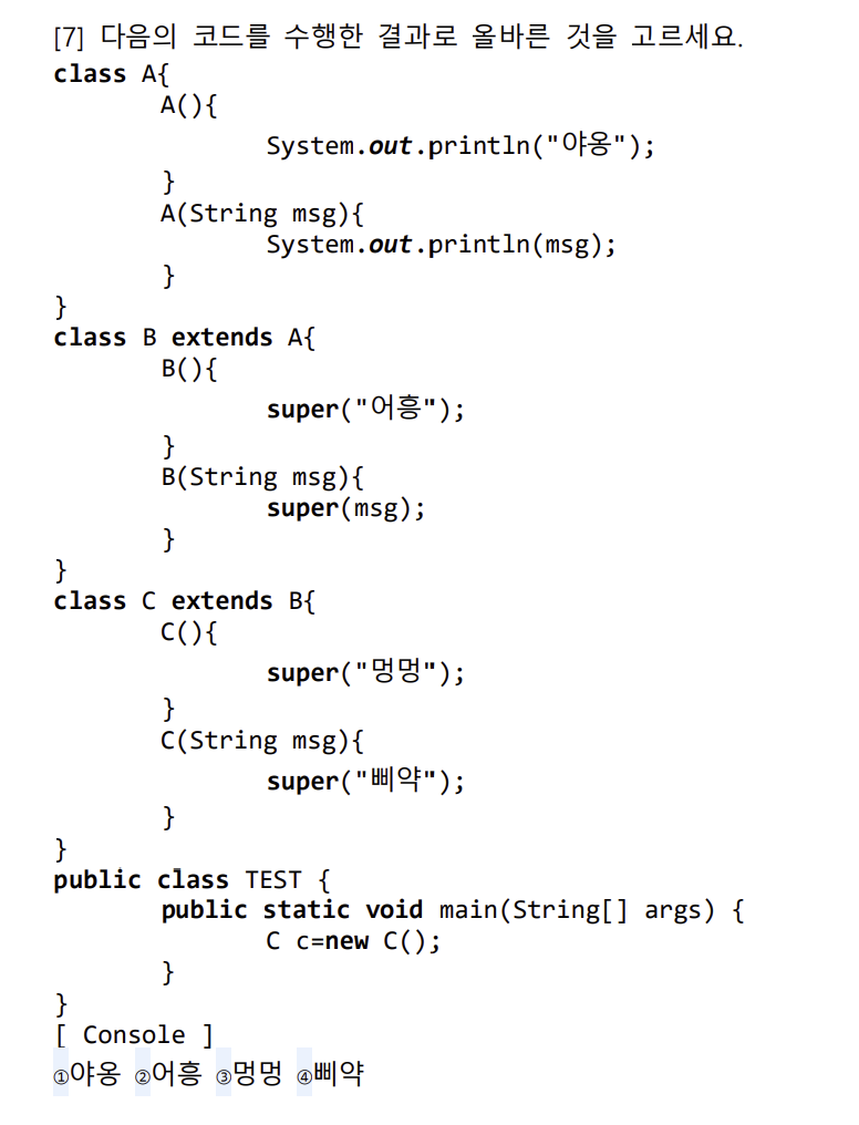 B(String msg)로 올라가면 또 super(msg)를 만날 수 있는데, B클래스는 A클래스를 상속받고 있으므로 A(String msg)로 올라가면 인자로 들어온 msg를 그대로 출력하도록 하고 있다.