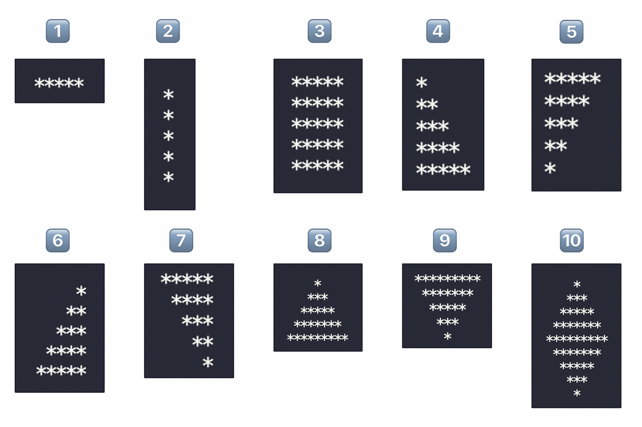 중첩 for문을 위해 다시 시작된 별 찍기 타임.. 1번 문제package star;public class Star1 { public static void main(String[] args) { for(int i =0; i 실행결과2번 문제package star;public class Star2 { public static void main(String[] args) { for(int i =0; i 실행결과3번 문제package star;public class Star3 { public static void main(String[] args) { for(int i =0; i 실행결과4번 문제 package star;public class Star4 { public static voi..